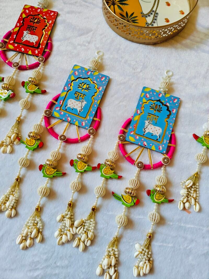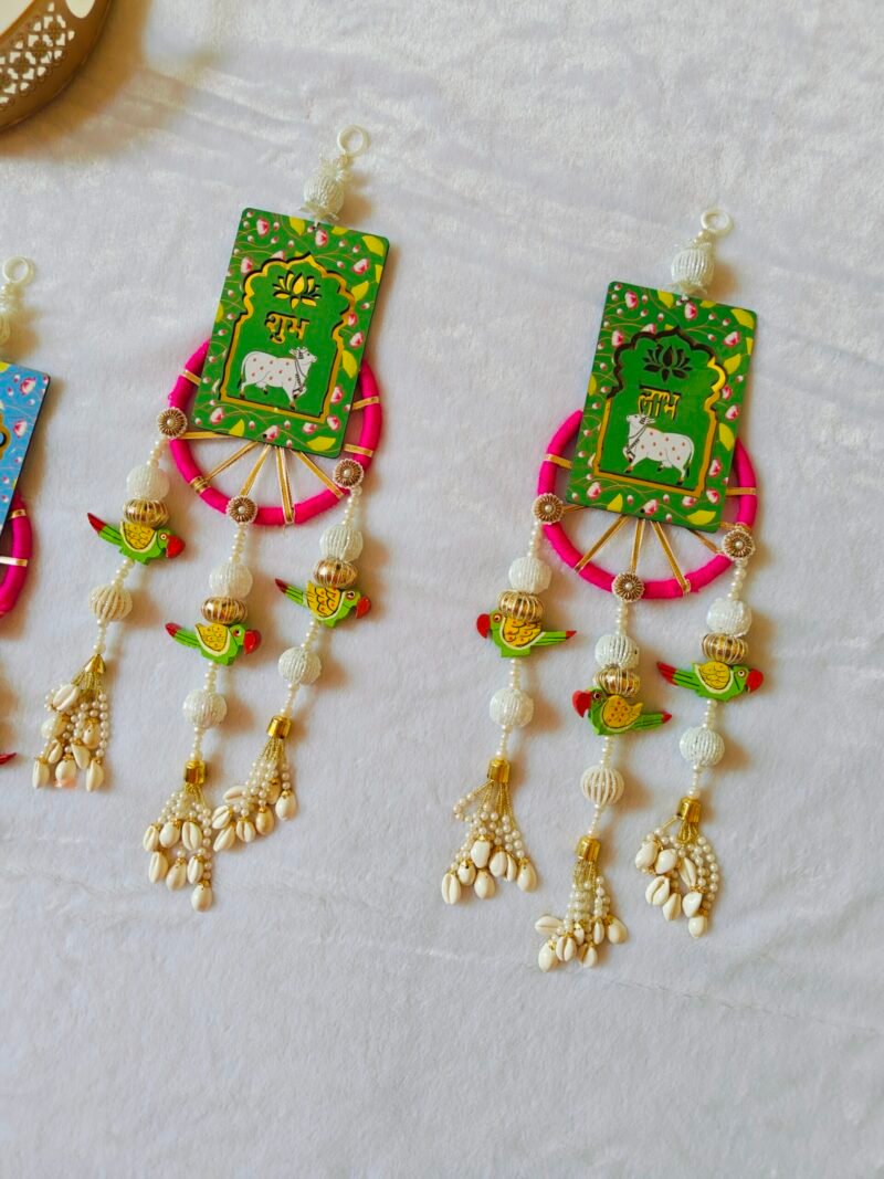 Welcome abundance and positivity with this handcrafted Shubh Labh wall hanging, inspired by Pichwai art and detailed with sacred shells and vibrant parrots.